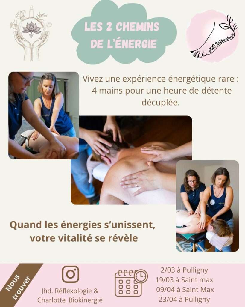 Et si vous pouviez vivre une expérience de détente profonde, où deux thérapeutes unissent leurs savoir-faire pour vous offrir une heure de rééquilibrage complet ? C’est ce que nous vous proposons avec « Les deux chemins de l’énergie », un soin énergétique exceptionnel à 4 mains, alliant réflexologie et biokinergie.